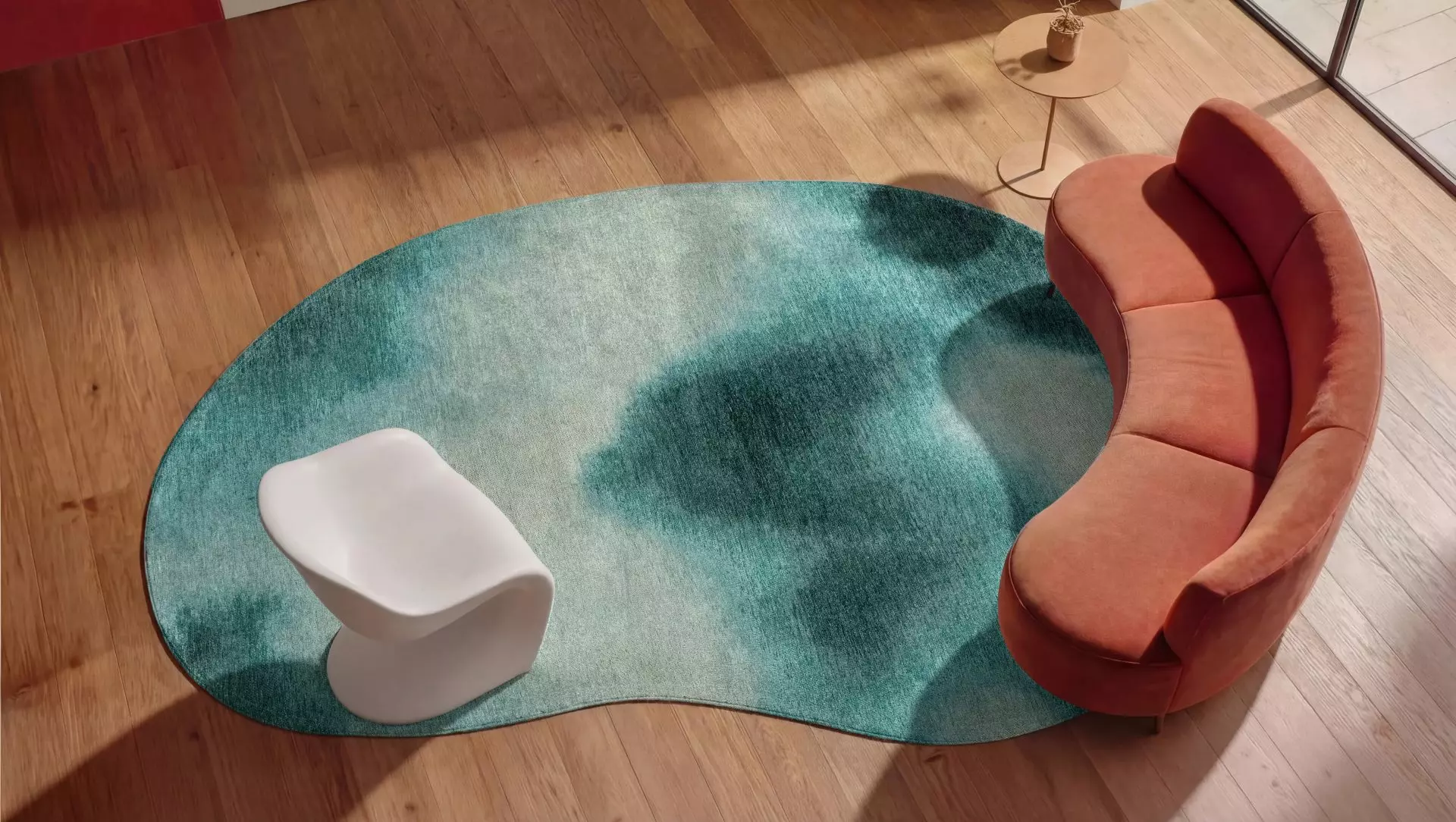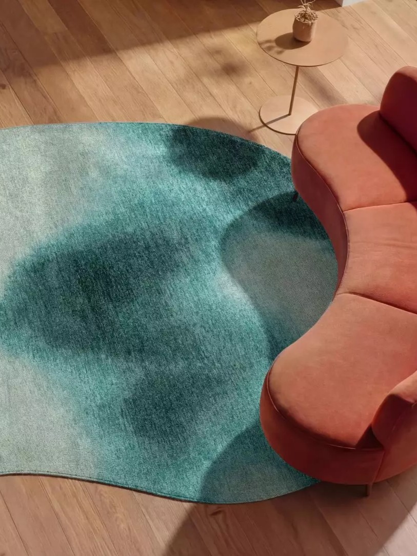 Nietypowa forma dywanu AQUARELLE doskonale przełamuje geometryczne linie mebli i architektury. Dzięki temu dywan o nieregularnym kształcie idealnie podkreśla aranżacje w stylu nowoczesnym, minimalistycznym, japandi czy soft loft.